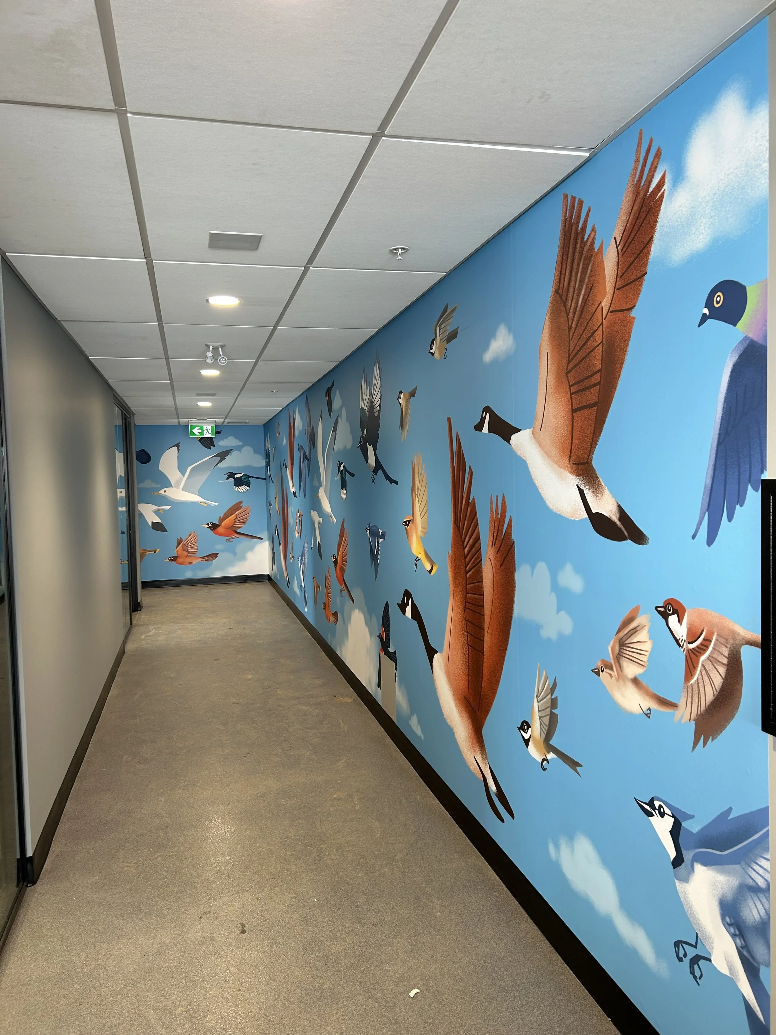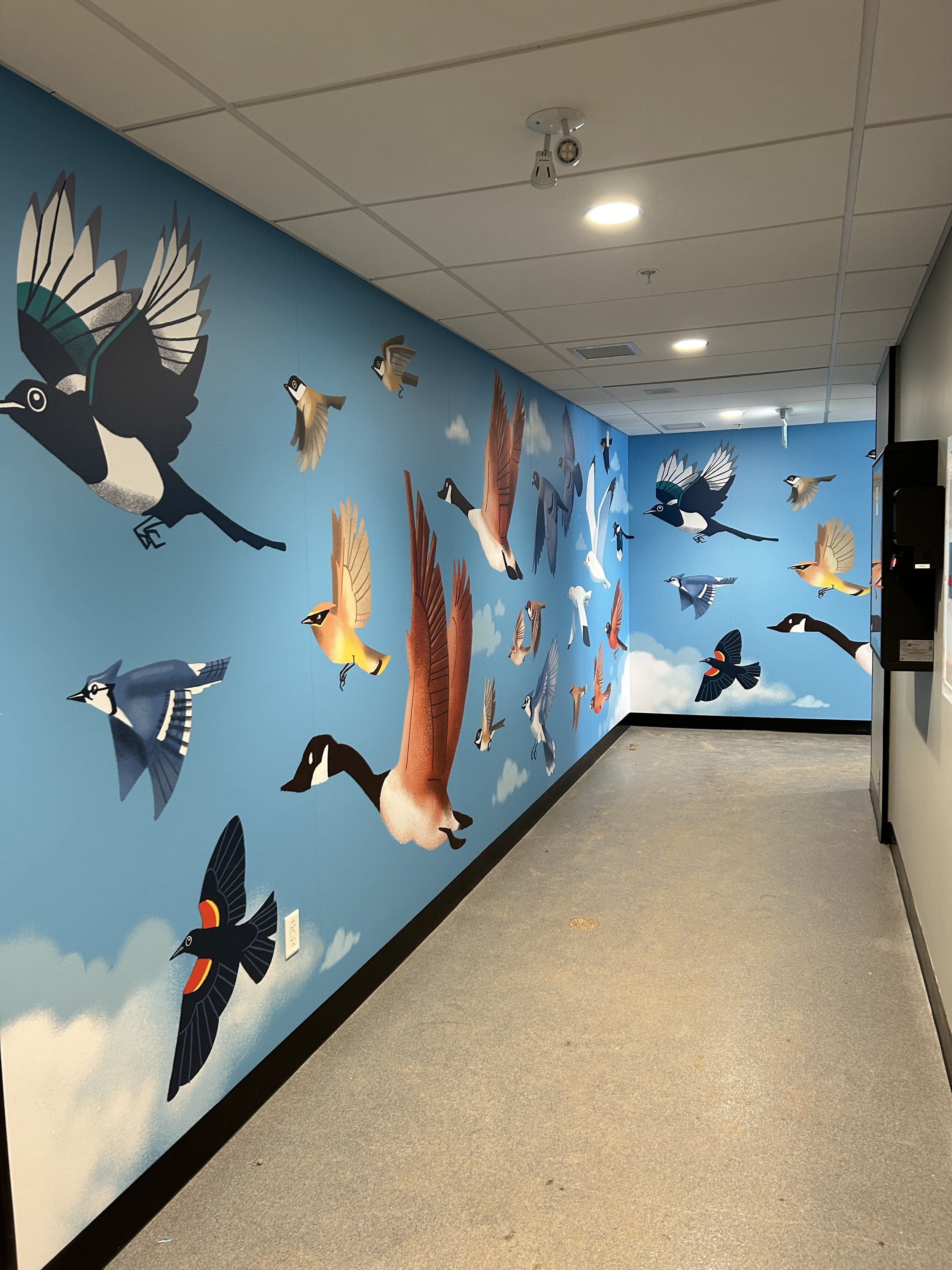 I had the opportunity to work with Strathcona County early 2024 to design a mural based on my idea of illustrating local birds that are common in the area. The vinyl mural is situated down a long hallway where hundreds of employees pass by everyday. It is also in front of a lunchroom which is why I wanted to make the colours calm and enjoyable. The mural measures 21.5’ x 9’ and is repeated 3 times.