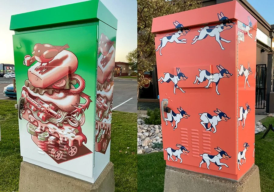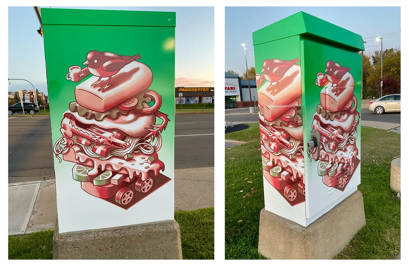 For this project the Stony Plain Road Business Association asked to use two of my images for electrical boxes located in West Edmonton around Stony Plain Road. The two images include a cover illustration for Hungry Zine and illustrations of my late dog running which I previously used in a mural on Churchill Square Edmonton AB.
