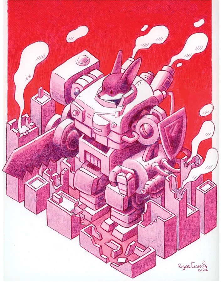A gouache and coloured pencil work featuring my former dog Pachin as a giant mech walking through a city. This piece is currently up on display at Latitude 53 Gallery as part of their annual fundraiser SCHMOOZY until October 1st. 2022 and is also available for purchase online or in person with half the proceeds going towards helping Latitude 53 Gallery.